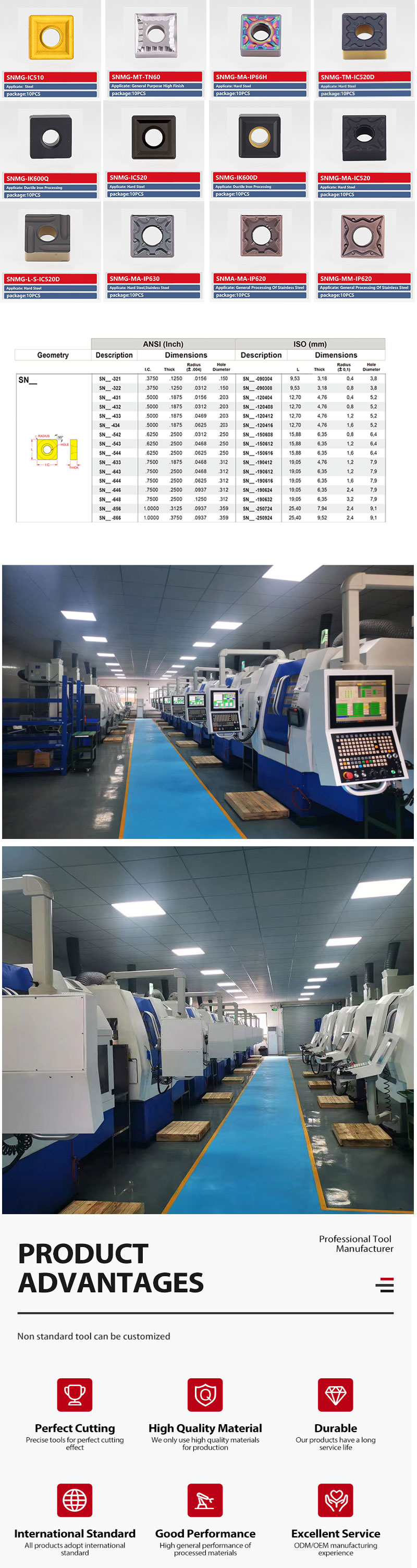 1. Preferred raw materials: Carbide base material is carefully crafted, with sharp cutting edge, smooth chip breaking, ensuring wear resistance and service life 2. German technology, sharp and durable: The blade is processed with German technology, with stronger overall hardness The cutting edge is sharper and wear-resistant, and has a longer service life 3. Sharp non-stick blades, high-precision blades, effectively reduce friction and reduce loss 4. Prioritize tools with high thermal conductivity 5. Sharp cutting edge lines, wide chip breaker grooves, can reduce cutting pressure and smooth chip removal 6. Choose appropriate cutting conditions, inappropriate processing conditions will reduce the service life of the tool; 7. Choose appropriate tools, the tool should have strong toughness, and the cutting edge strength and coating bonding force should also be relatively high 8. Double-sided sharpness; Different R angles meet your needs for fine turning and rough turning, reduce cutting resistance, and achieve sharp cutting